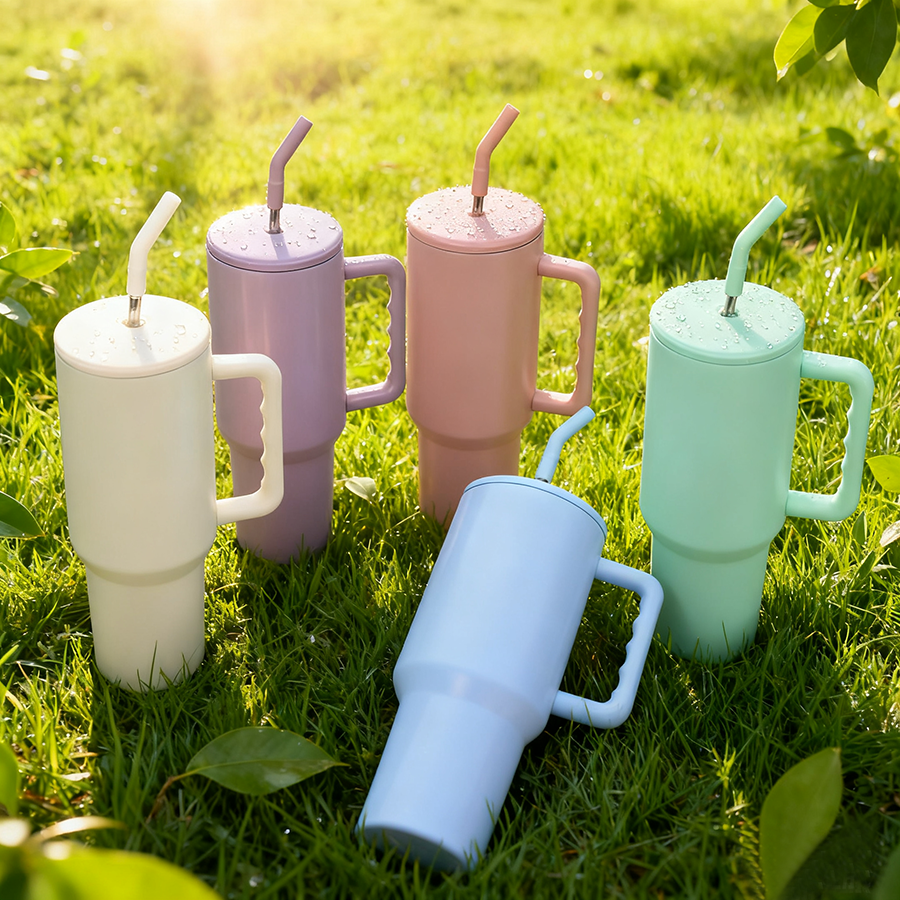 Discover the perfect fusion of style and function with our 40oz sublimation tumbler, featuring a delightful macaron color palette and complete with a convenient handle and straw. Crafted from premium stainless steel with a specialized sublimation coating, this tumbler transforms into a vibrant canvas for your custom designs. The ergonomic handle provides comfortable portability while the included straw makes every sip effortless.
