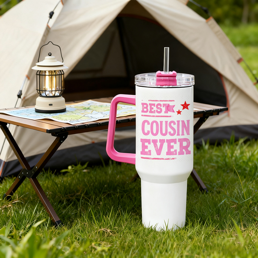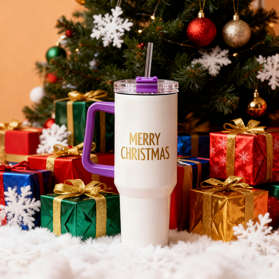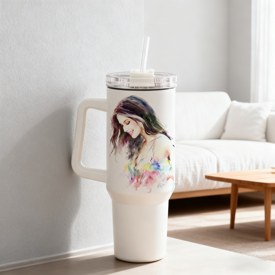 Elevate your brand presence with our high-capacity 40oz sublimation tumbler, expertly designed with a sturdy, comfortable handle for ultimate portability. Crafted from premium stainless steel, this blank tumbler features a specialized coating that perfectly captures the vibrancy and detail of your artwork through the sublimation process. The result is a stunning, full-color, 360° wrap design that is permanently fused into the surface, making it scratch-resistant, fade-proof, and dishwasher-safe for long-lasting durability.