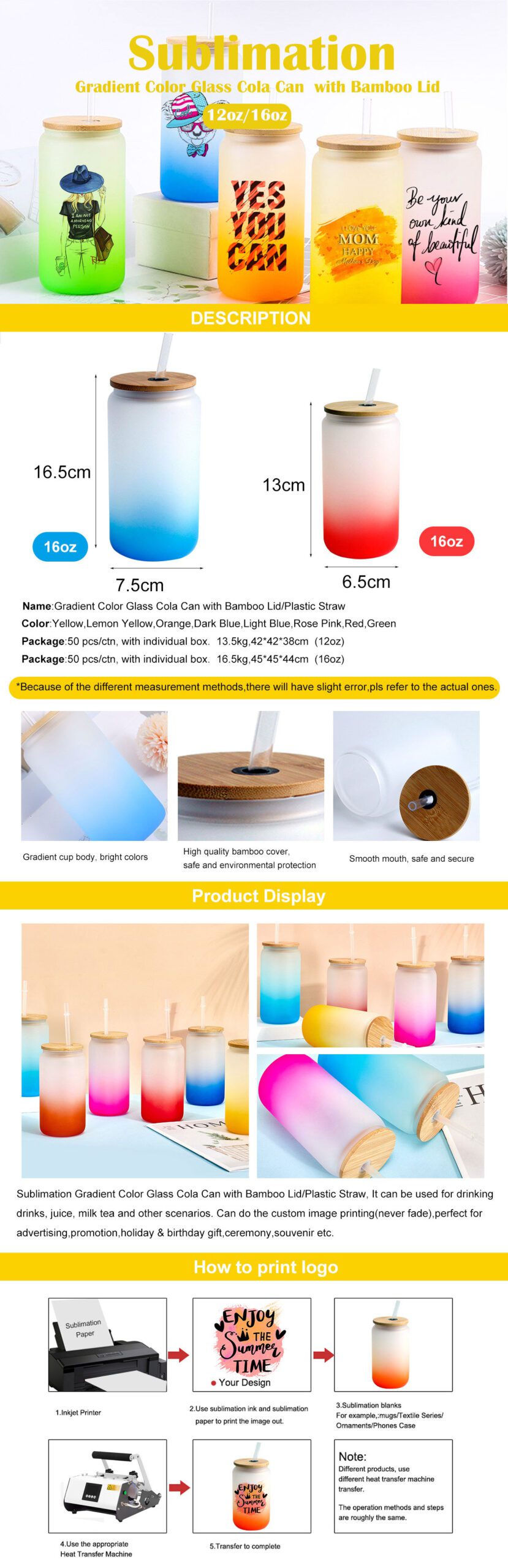 This 16oz sublimation glass cola can redefines beverage storage with its bold capacity and versatile design! Made from premium borosilicate glass, it features advanced 360° dye-sublimation printing for vivid, scratch-resistant branding, artwork, or modern graphics. The 16oz (470ml) large volume is ideal for sodas, iced coffees, or homemade juices, while the reinforced shatter-resistant body and leak-proof silicone seal ensure durability. Blending a retro metal lid with a contemporary matte finish, it suits family gatherings, outdoor adventures, restaurant promotions, or event giveaways. Customize with no minimum order—eco-friendly and built to elevate your brand’s presence!